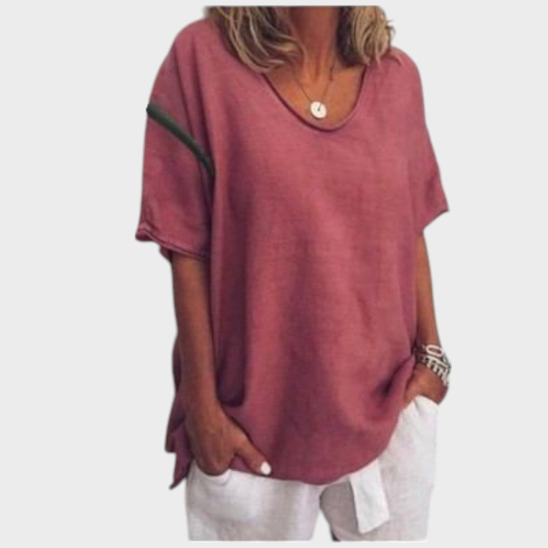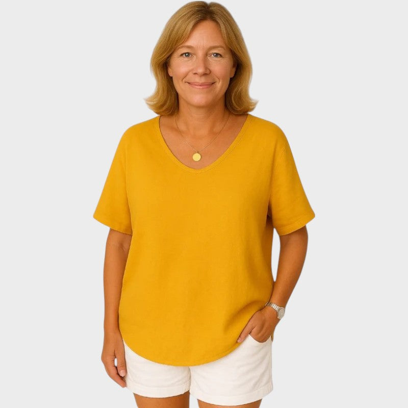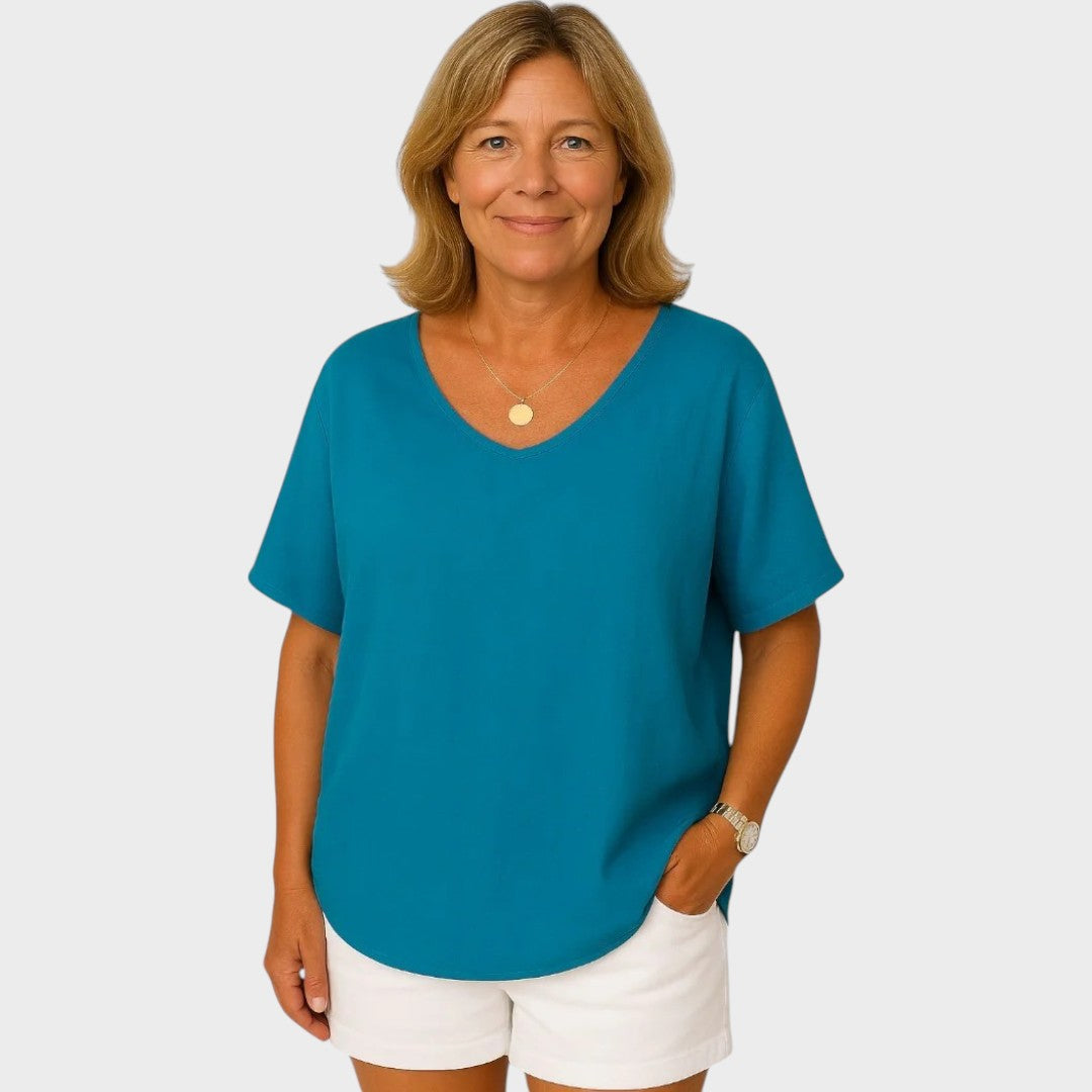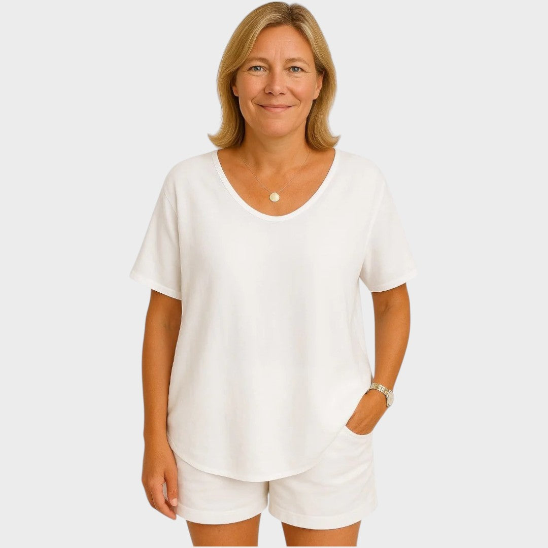 Grace es ese jersey básico que marca la diferencia en tu armario. Con un corte holgado y cómodo, cuello redondo y mangas cortas, es el jersey ideal para los días relajados sin renunciar al estilo. Confeccionado en un tejido suave y transpirable, se adapta al cuerpo con ligereza y suavidad.